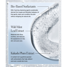 Přírodní tenzidy z jablek a brazilského oleje babassu vytvářejí bohatou a krémovou pěnu, která jemně čistí a zároveň pečuje o pokožku, přičemž napomáhá zlepšení její textury a vzhledu. Extrakt z divoké máty pleť čistí a zklidňuje, zatímco antioxidanty nabitý extrakt z kakadu švestky ji chrání a rozjasňuje. Složení je navíc obohaceno o naši patentovanou směs organických adaptogenních bylin, nyní ve formě glycerinu, díky čemuž je pokožka po použití čistá, jemná a pružná – nikdy napjatá.