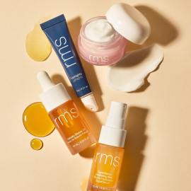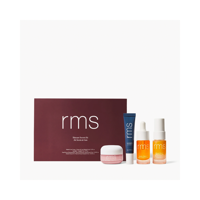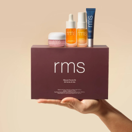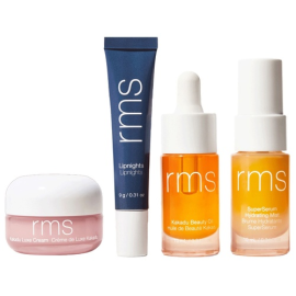 Dárkový set čtyř ikonických skincare produktů RMS pro rozjasněnou a dokonale hydratovanou pleť a rty. Travel size.